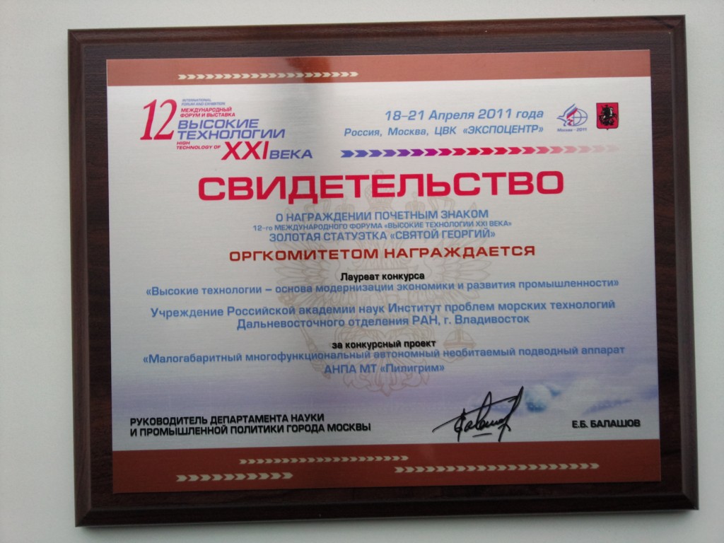 ИПМТ ДВО РАН принял участие в 12-м Международном Форуме и выставке «Высокие технологии XXI века» (апрель 2011г., г. Москва). Оргкомитет конкурса наградил ИПМТ ДВО РАН Дипломом за достижения в области высоких технологий, а решением наградной комиссии проект «Малогабаритный многофункциональный автономный необитаемый подводный аппарат АНПА МТ «Пилигрим» получил награду почетный Золотой знак Форума «Статуэтка «Святой Георгий».