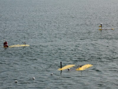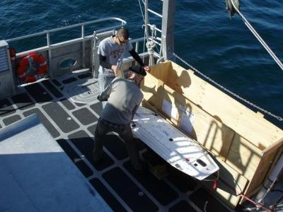 В течение недели проходили испытания 11- метрового безэкипажного катамарана SCOAP, изготовленного компанией SeaRobotics дляРод-Айлендского университета, при поддержке NFS. Типовой задачей комплекса станут океанографические работы по трансектам длинной 15-20 км с десятком станций в каждой. Съемка на всех станциях выбранного района будет проводиться с частотой до 4 раз в сутки, выявляя изменчивость свойств среды. Катамаран имеет как встроенные приборы типа ADCP, так и возможность нести автоматизированную лебедку для развертывания других гидрографических приборов, в том числе буксировать ГБО.